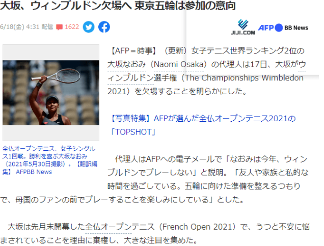 因为心理问题,大坂直美不仅抵制法网新闻发布会,并在第二轮开打前宣布退赛,为此她遭到了1.5万美元的罚款。近日温网官方怀着极大的诚意积极主动与大坂直美的团队沟通,就在昨日温网首席执行官萨莉-博尔顿表示大坂直美会参加今年的温网。 温网官方对媒体表示,他们积极与大坂直美团队保持联系,电话一直开通,他们还表示:“每个球员都知道,我们的大门在任何时候都是敞开的,这非常重要,因此可以关于任何问题与我们对话,这扇门是敞开的。而作为一个组织,我们一直在努力做得更好,以保护球员利益。” 而就在昨日,纳达尔宣布退出温网和东京奥运会。不过大坂直美这次是以日本球员身份获得奥运参赛资格,她的团队在退出温网的声明里表示,大坂直美很期待今年的东京奥运会,她正在专心准备,她很期待在家乡球迷面前登上奥运赛场。