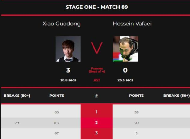 与瓦菲-阿尤里的这场比赛,肖国栋只有赢下比赛才能晋级,而肖国栋也没让人失望,他以3-0轻松胜出小组第一晋级。第一局,肖国栋与瓦菲-阿尤里打得比较胶着,在拉锯战中,他以66-38先胜一局,1-0先拔头筹。第二局,瓦菲-阿尤里手感依旧不佳,而肖国栋手感火热,他打出单杆70分,2-0扩大优势。 第三局,肖国栋没有任何松懈,他一鼓作气67-5再胜一局,总比分3-0轻松战胜瓦菲-阿尤里。三轮小组循环赛结束之后,肖国栋以2胜1平战绩反超至小组第一,力压对手强势晋级。