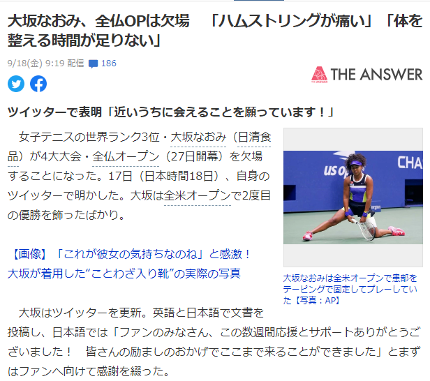 在之前的今年美网女单决赛中,大坂直美逆转阿扎伦卡第二次赛会夺冠。拿到第三个大满贯冠军的她,也超越中国名将李娜成为亚洲网球第一人。在美网之前的辛辛那提公开赛上,原本就应该是大坂直美与阿扎伦卡两个人争冠,但大坂直美因为左大腿疼痛放弃了那场比赛。在随后征战美网的时候,大坂直美左大腿都是紧缠绷带出战。 大坂直美在个人社交平台上用日文和英文做出退赛法网的解释,她表示:“我的腿部依旧有疼痛感,所以我没有时间准备红土比赛,美网和法网这两场大满贯赛事对于我而言,在时间上实在太接近了。”大坂直美还表示:“感谢你们在过去三周给我的支持,遗憾的是,我因伤不能出战今年法网,希望赛事组织者和球员一切都好,想念你们,希望尽快回归。” 日媒指出大坂直美不太擅长打红土,她从2016年开始连续四年征战法网,2016年打进第三轮2017年止步第一轮,2018年和去年也都只是打到第三轮。目前这届法网已经有女单世界第一巴蒂和新科美网冠军大坂直美退赛,距离今年法网开赛还有9天,接下来还可能会有哪些球星退赛非常值得关注。 9月16日日本网球协会在网上召开常务理事会,决定推迟向大坂直美发今年美网夺冠的奖金。受到新冠疫情的影响,今年的ATP日本公开赛取消,导致该协会损失至少10亿日元(大约6450万人民币)。日本网球协会去年总收益为23亿日元(约1.48亿人民币),今年受疫情影响估计达不到去年收入的一半水平。鉴于目前严峻的财务状况,日本网球协会决定推迟向大坂直美发今年美网夺冠的奖金。